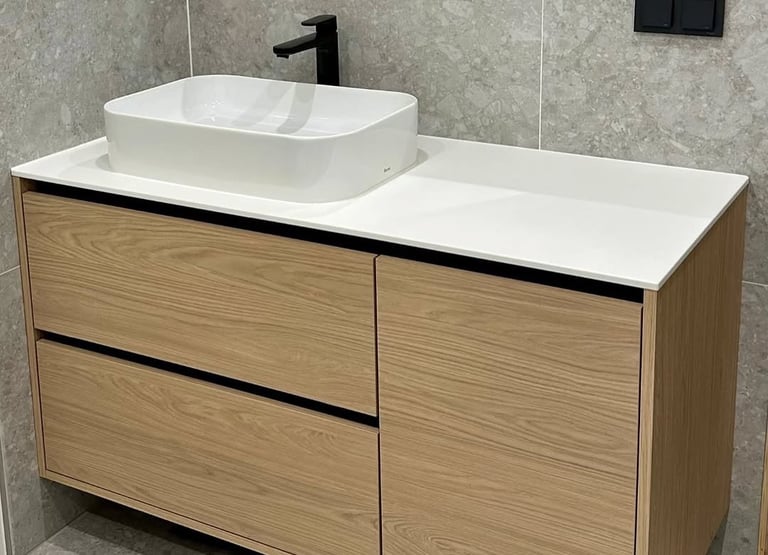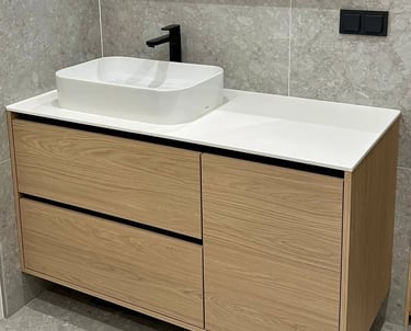 Custom bathroom furniture including vanity units, mirror cabinets, and storage solutions. Designed for hospitality and residential applications with moisture-resistant construction.